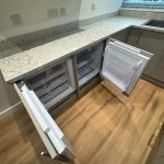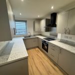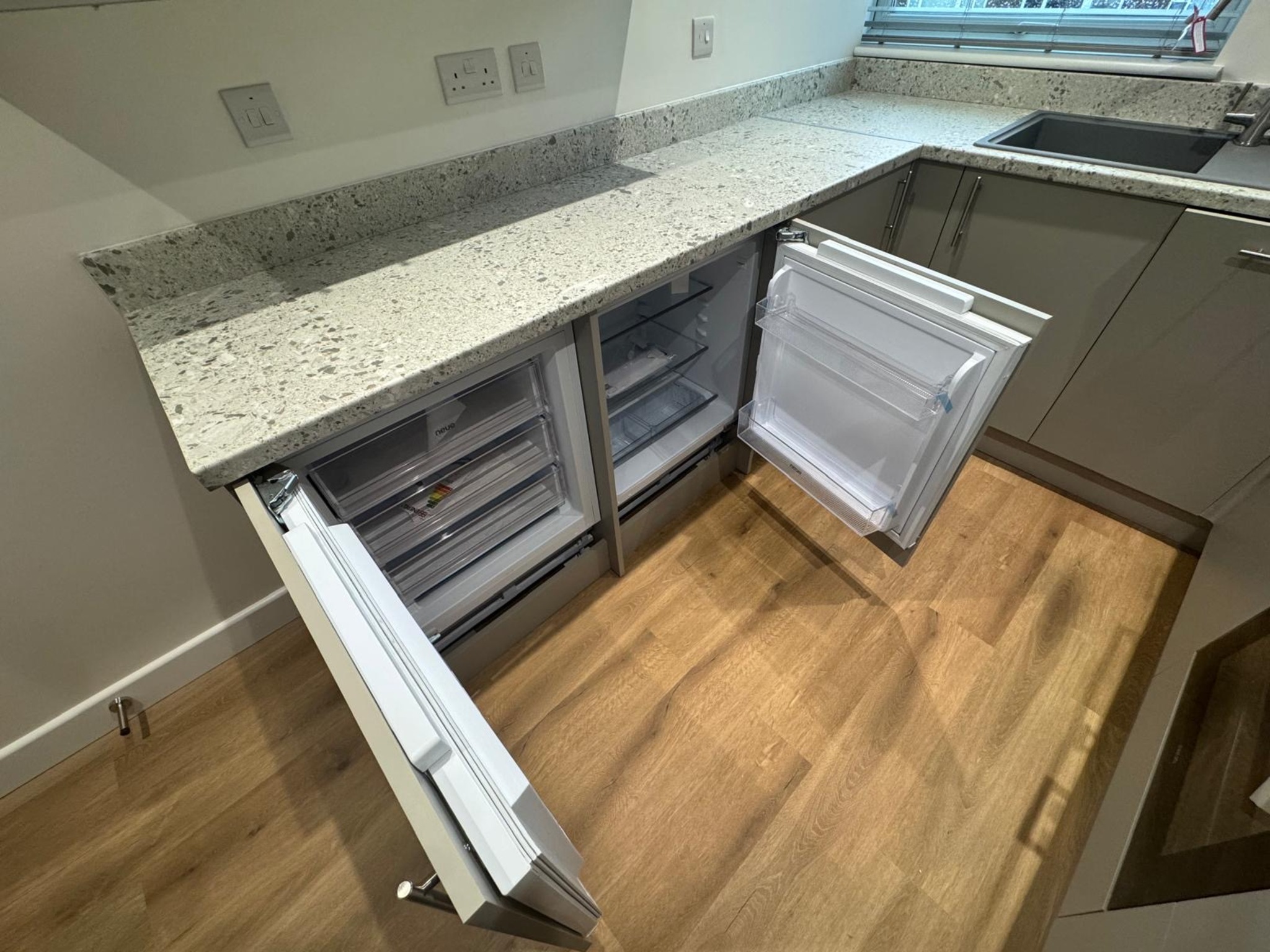 - An unfurnished modern interior, the fullyfitted kitchen comprises a dishwasher, undercounter refridgerator and freezer and electric hob.