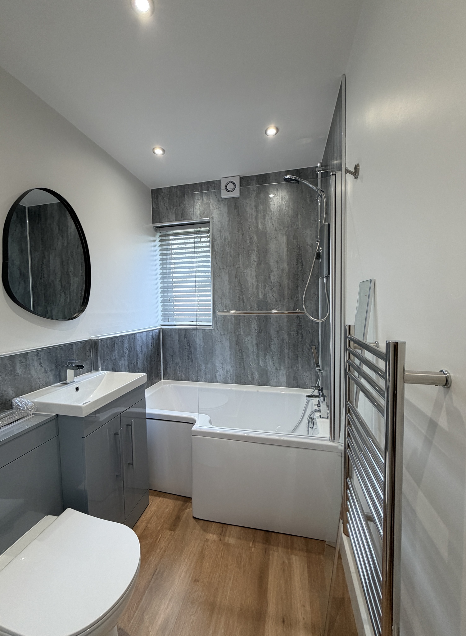 -Modern fitted bathroom with a dual bath and shower for comfort and convenience. A heated towel rack is also provided.