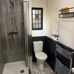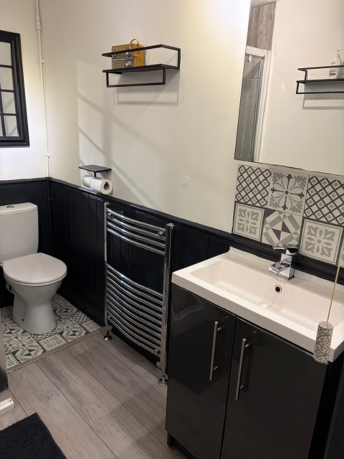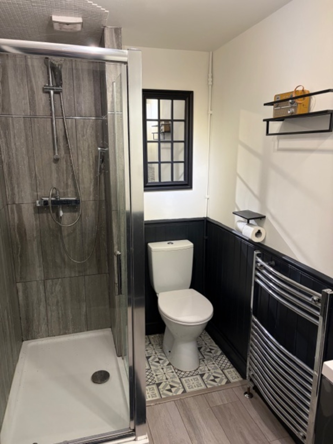 - First floor shower room with walk-in shower, under sink storage and heated towel rail.