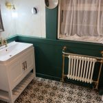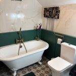 - Ground floor elegant bathroom with dual bath and shower. Large sink with gold accents, marble walling and over sink mirror.