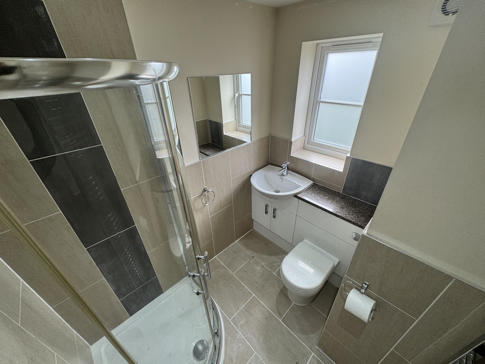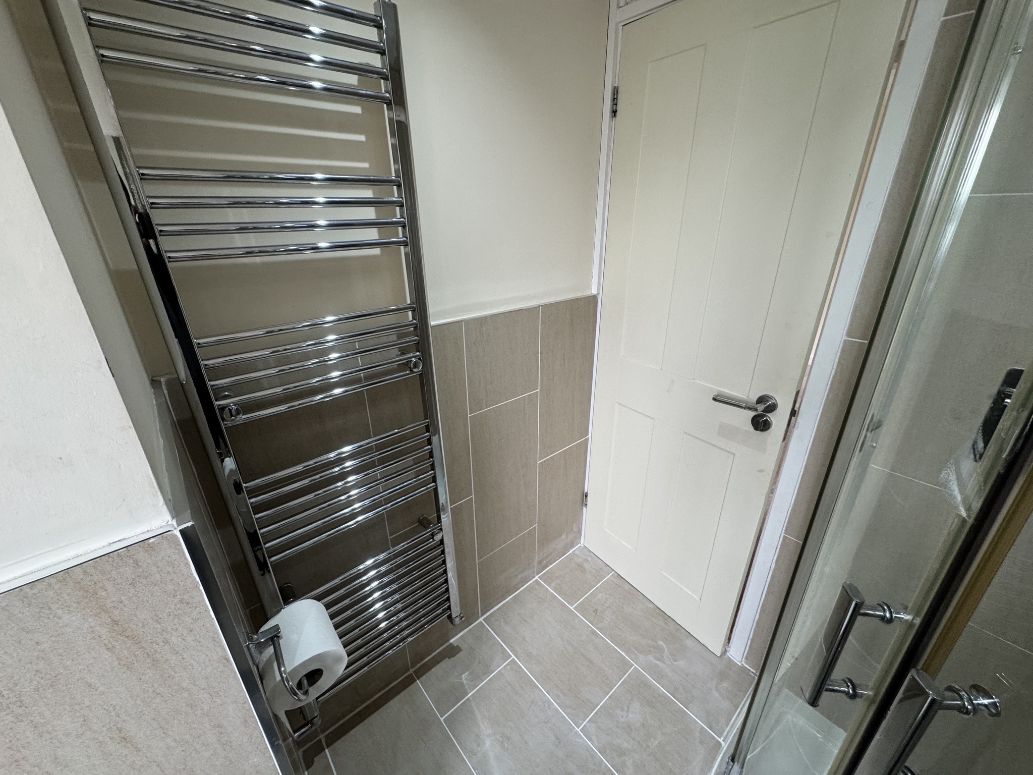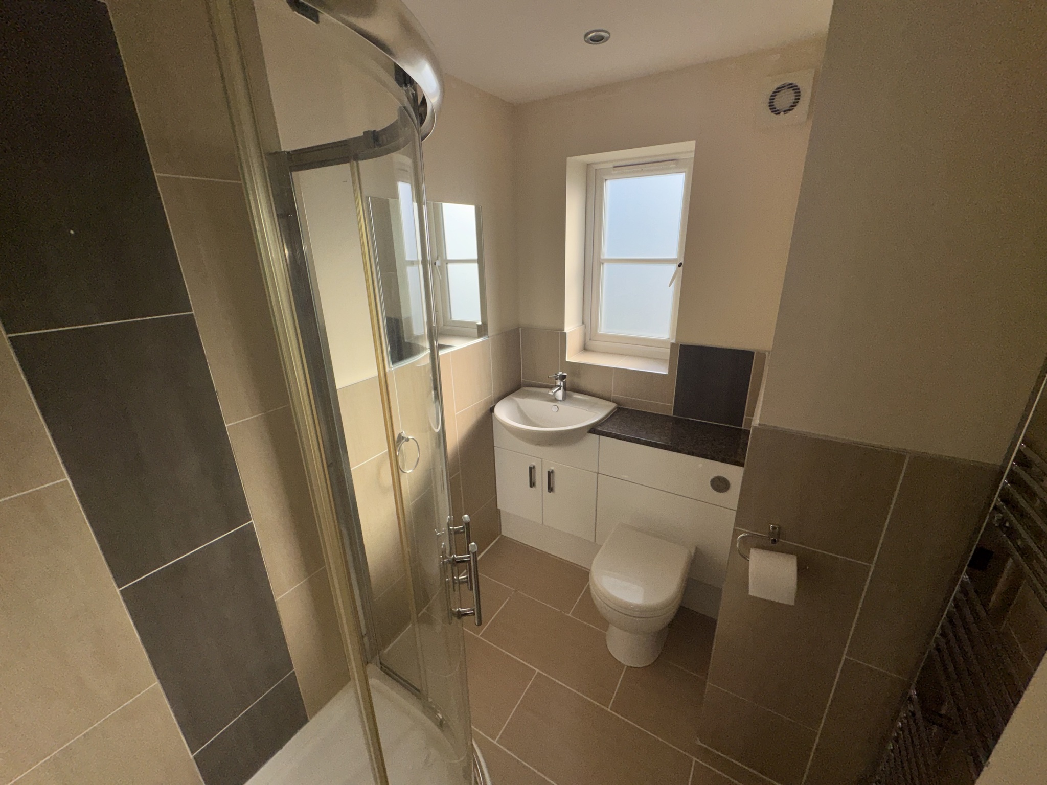-Shower room with walk in shower and heated towel rail finished to a high standard.