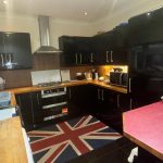 Fitted with a range of wall and base units, integrated sink and cooker, extractor fan, and space for appliances. Double-glazed windows to the rear.