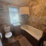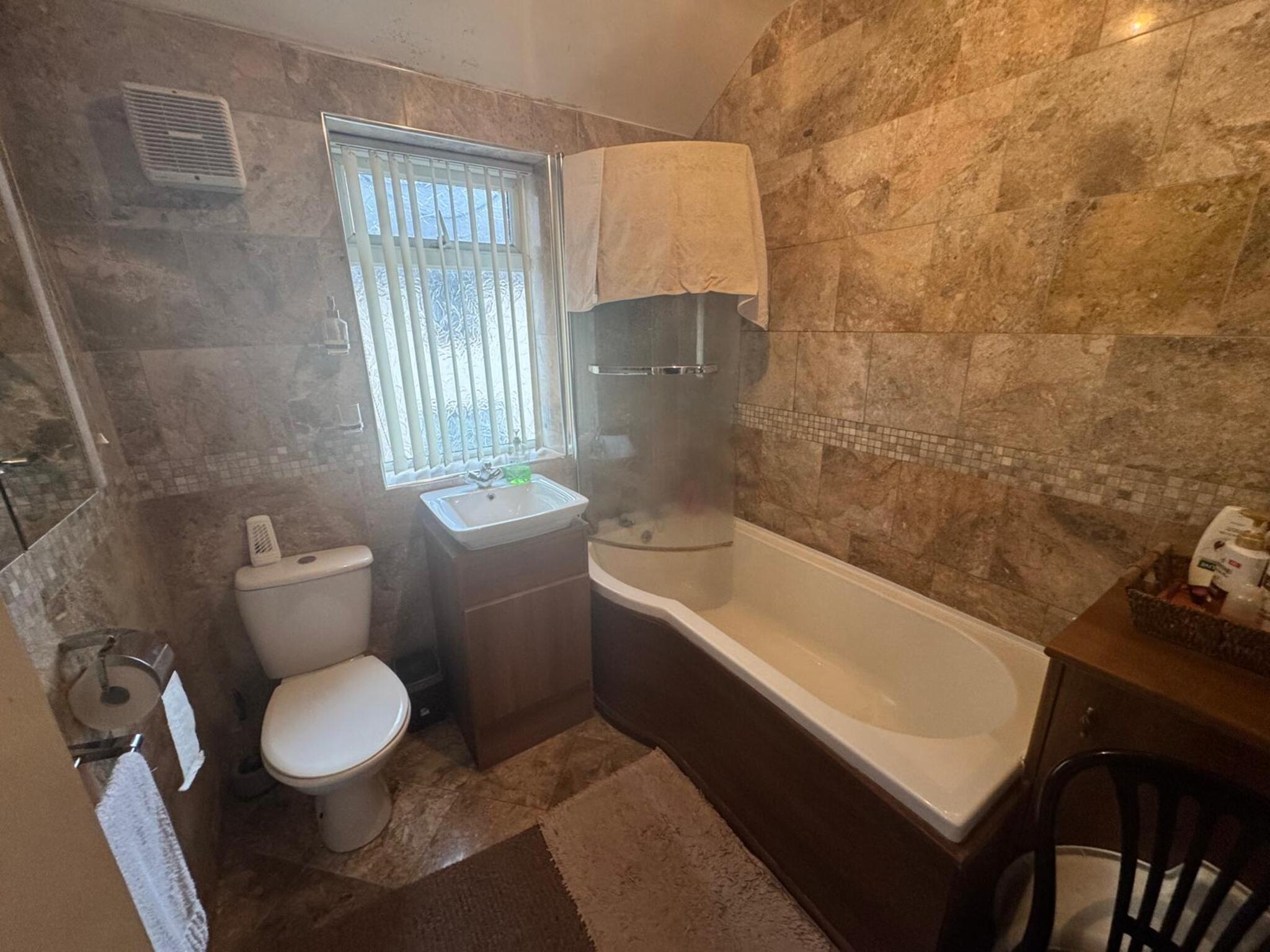 Fitted with panelled bath, low-level WC, and wash hand basin.