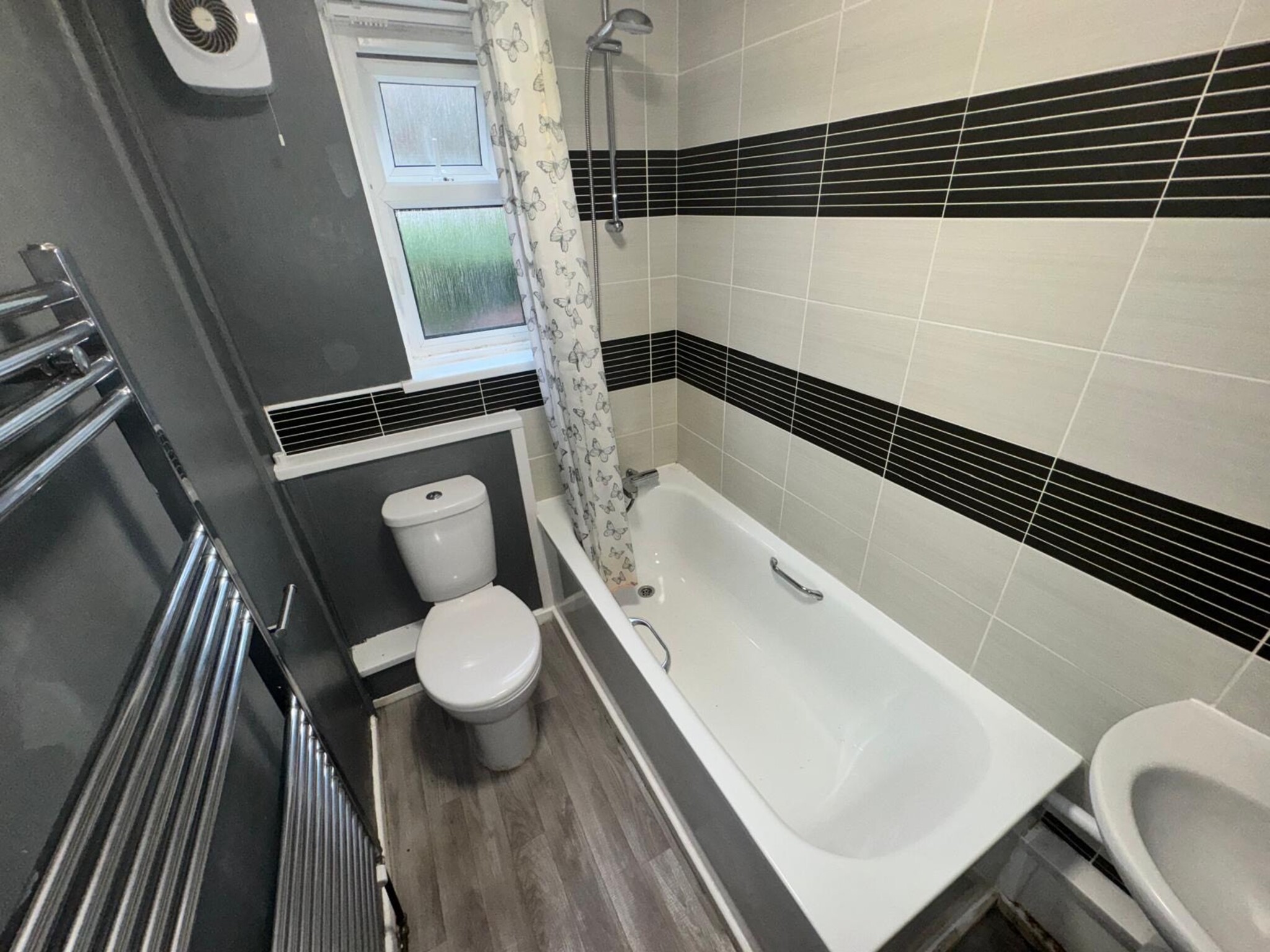 -Modern fitted bathroom with a dual bath/ shower and a heated towel rack for comfort and convenience.