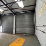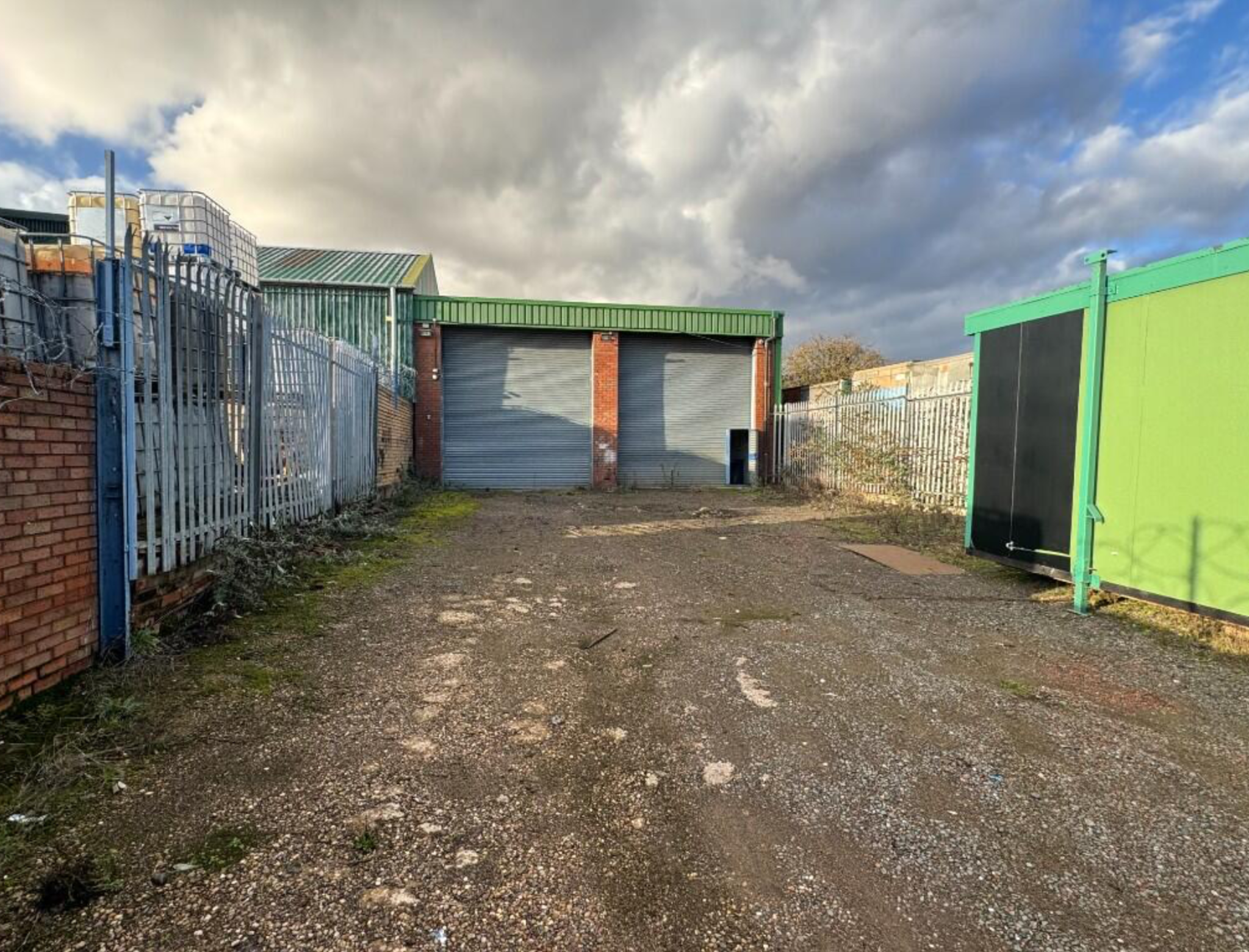 A robust industrial unit of steel truss construction with concrete floors and brick/clad elevations. Roller security shutters access directly onto a large, secure gated yard.